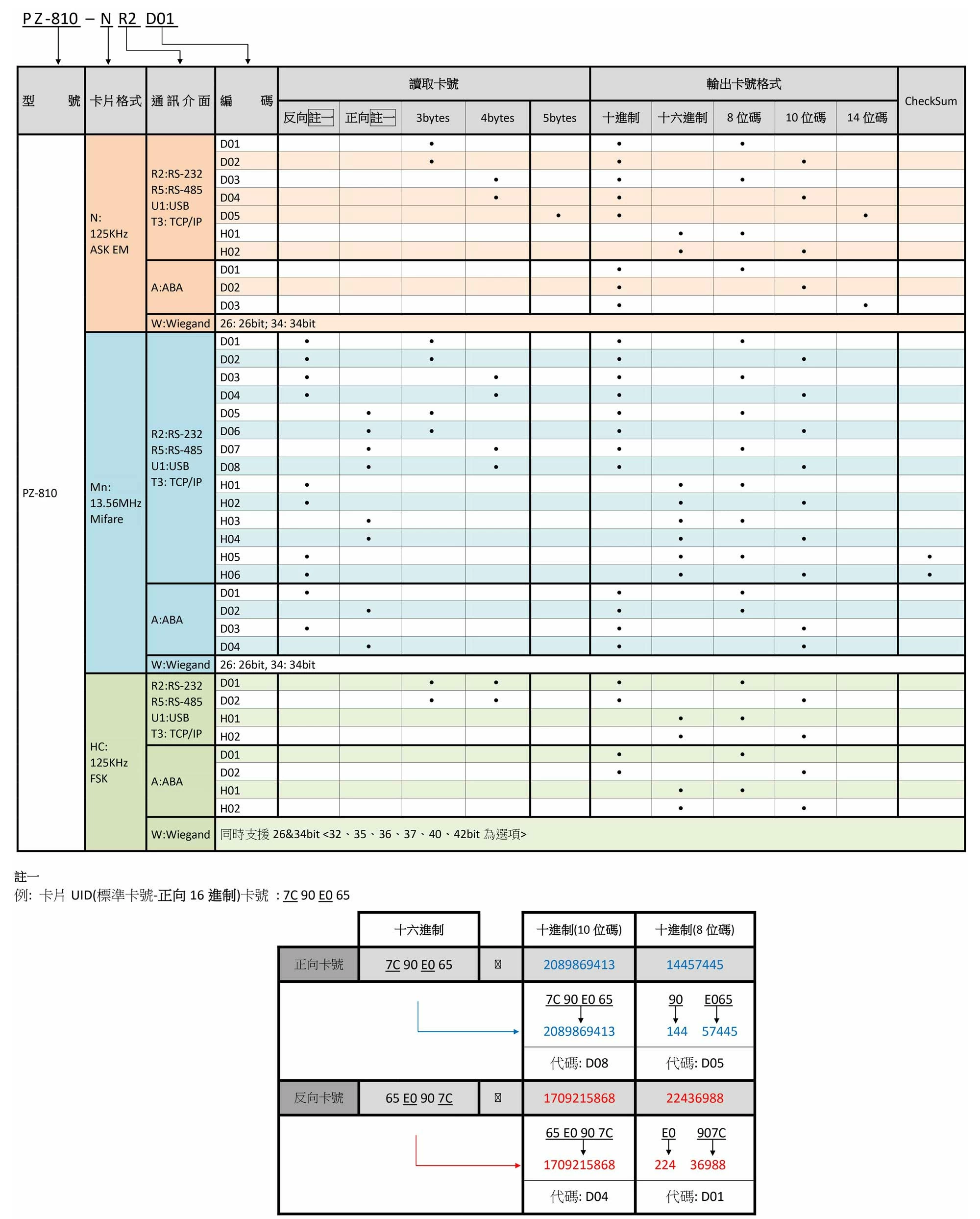 - PZ-810NT3D05 : 125KHz EM金屬感應讀頭, TCP/IP, 讀取卡號:5 bytes,10進制,14位碼